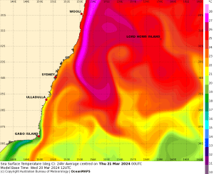 All this drew me to the IMOS Current News website. This is a marvelous source of ocean information, well-illustrated with visualisations of data and clearly written. David Griffin and the IMOS team are to be congratulated in bringing this information to a wide audience. It is a continuous flow of “stories” related to understanding and use of current, SST, and biological material. Angus Gordon reminded me that wearing his sailing cap he has been using IMOS current data for many years in planning his ocean racing tactics. He notes that the strength of flow past headlands is very dependent on the local angle of the current to land. If the current is locally angled towards the headland the current at the headland is far stronger, meaning one needs to go as close as courage would allow. Griffin and Pilo in Ocean Current News of 22 December 2023 highlighted to those racing in the Sydney-Hobart that they would experience “exceptional currents” associated with the presence of warm core eddies. But they went further in alerting boats to beware of tropical basking sunfish given “exceptionally high” SST.